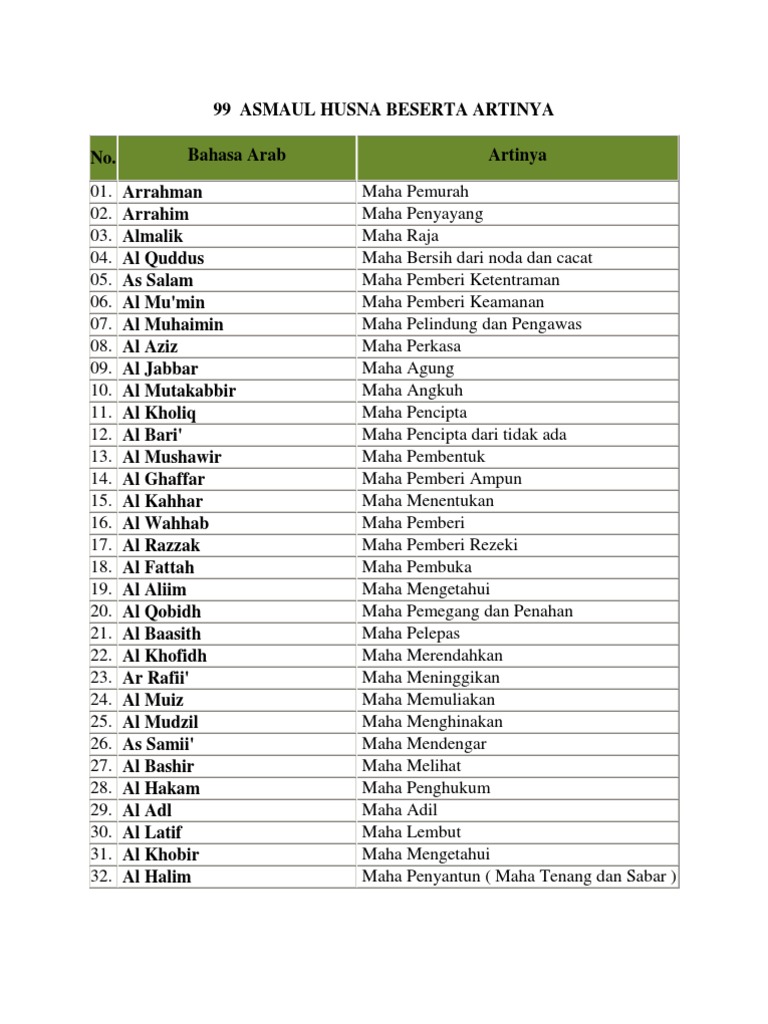 Arab, latin, artinya, dan manfaatnya, pengertian dan hakikat asmaul husna. Berikut liputan6.com rangkum dari berbagai sumber, rabu (5/8/2020) tentang. 99 asmaul husna beserta arti. Setiap asmaul husna memiliki arti dan makna tersendiri yang tentunya sangat baik. Ar rahman (الرحمن) yang maha pengasih.